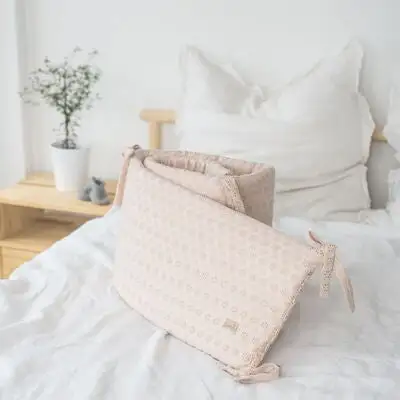 En myk og praktisk sengekant fra Babyly, som forhindrer at barnet ditt slår seg mot eller blir sittende fast mellom sprinklene på sprinkelsengen. Den er laget av et behagelig bomullsmateriale, og har en myk vattering i skummateriale. Trekket kan tas av og vaskes i maskin.Dette produktet er Oeko-Tex-sertifisert, noe som betyr at det er garantert fritt for skadelige kjemikalier.