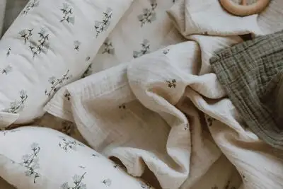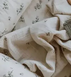 To myke musselintepper fra GarboFriends som passer perfekt å ha på sofaen, i sengen eller med på reisen! med et pustende materiale i bomullsmusselin. De har et søtt blomstermotiv. – 2-pakning– Anbefalt alder: fra nyfødt– 100 % bomullsmusselin