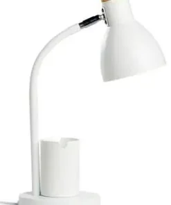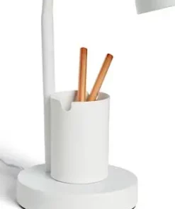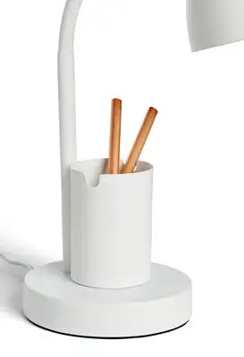 Stilren Martin skrivebordlampe fra JLY med et praktisk rom til blyanter. Perfekt til leksearbeid og som leselys. – CE-merket. – E14 25W maks 25 V. – Anbefalt alder: fra 2 år. – Jern, tre.