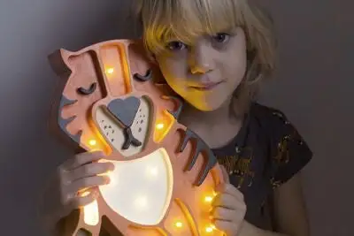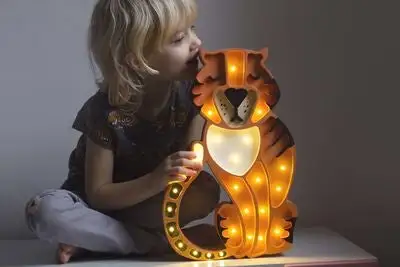 En søt og dekorativ lampe fra Little Lights. Denne barnelampen har en søt tigerdesign, og er dekket med små hull, som skaper et behagelig lys i rommet. Slå på og av lampen ved hjelp av fjernkontrollen, som har en smart dimmerfunksjon samt timer. En perfekt lampe på veggen, eller på et bord, lent inntil veggen!
