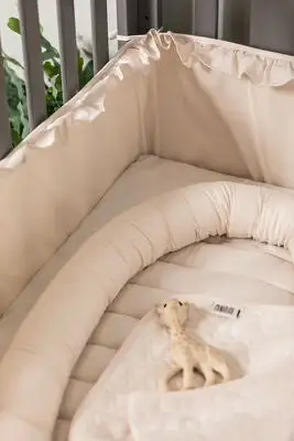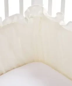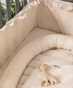 En myk sengekant fra Minitude, i den fine fargen snow white. Den har et trekk i myk polyester, og er fylt med polyuretan. Søte volangdetaljer pryder denne praktiske sengekanten, som beskytter barnet ditt fra sengens harde kanter, og forhindrer at armer og bein blir sittende fast mellom sprinklene i sprinkelsengen.