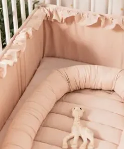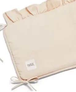 En myk sengekant fra Minitude. Den har et trekk i myk polyester, og er fylt med polyuretan. Søte volangdetaljer pryder denne praktiske sengekanten, som beskytter barnet ditt fra sengens harde kanter, og forhindrer at armer og bein blir sittende fast mellom sprinklene i sprinkelsengen.