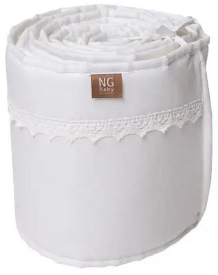 En søt sengekant med blondedetaljer, fra NG Baby. Sengekanten er laget av mykt linstoff, med bånd i kontrasterende farger, som du enkelt fester ved sengens sider. Den har en myk vattering, som effektivt beskytter barnets bein og armer mot sengens harde kanter. Sengekanten har en behagelig design som fint passer in i innredningen.