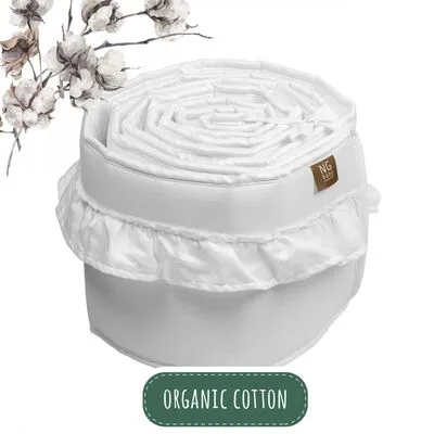 En søt sengekant fra NG Baby. Laget av myk økologisk bomull og vattert med fibervatt som beskytter ditt barn fra vuggens harde kanter. Beskyttelsen holder dessuten armer og bein innenfor sengen. De dekorative volangdetaljene gjør vuggen til en sjarmerende innredningsdetalj i barnerommet.Mål: 258 x 20 cm.Materiale: 100 % økologisk bomull.Fyll: Fibervatt.