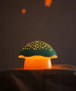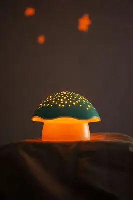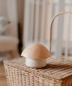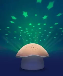 Pababo stjerneprojektor formet som en sopp er en batteridrevet nattlampe og projektor, som projiserer en fin stjernehimmel på barnets rom til fine, dyssende toner eller brusende lyder (hjertelyd). Lampen er trådløs og kan plasseres hvor som helst i rommet. Stjernehimmelen veksler mellom blått, grønt og orange og kan også stilles inn for å kun projisere en farge. Den smarte gråtesensoren tenner lampen om barnet gråter om natten. – Projiserer en stjernehimmel som sakte rører seg i taket. – Skrus på/av med et enkelt trykk – Slås av automatisk etter 22 minutter – LED-lampe som ikke blir varm – Spiller beroligende musikk på to lydnivåer eller brusende lyder (hjertelyd) – Gråtesensor