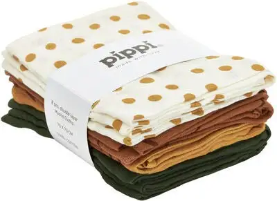 En praktisk 8-pack med musselintepper fra Pippi som du kan bruke til alt! Laget av herlig bomull som føles behagelig mot huden. Kan brukes som et lite teppe, sutteklut, tøybleie eller over skulderen for å beskytte klærne dine etter barnet har spist.