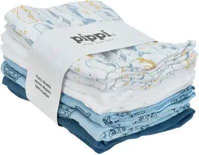 En praktisk 8-pack med musselintepper fra Pippi som du kan bruke til alt! Laget av herlig bomull som føles behagelig mot huden. Kan brukes som et lite teppe, sutteklut, tøybleie eller over skulderen for å beskytte klærne dine etter barnet har spist.