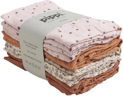 Praktiske, flerfargede musselintepper fra Pippi i økologisk bomull. – 8-pakning– Anbefalt alder: Fra nyfødt til 5 år– 100 % økologisk bomull