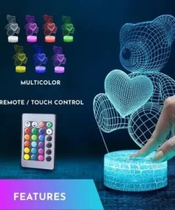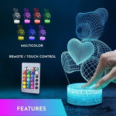 En kul 3D-lampe fra Powerpal, med en heftig bjørnedesign! Denne 3D -lampen er den nye generasjonen nattlamper – ta steget inn i fremtiden, med beroligende lys i mørket med en kul hologrameffekt! Velg din favorittmodell. Alle nattlampene har en kul, krakelert base for ekstra lys og stilig design. Barnet kan stille inn sin favorittfarge og lysnivå, for virkelig å gjøre opplevelsen akkurat slik hen vil ha den. Endre farge og lysnivå med fjernkontrollen eller touch.knappen. Nattlampen gir trygghet om natten, og passer alle aldre. Lades med USB -kabel (inkludert).