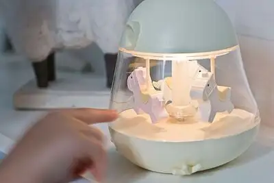 En kjempesøt nattlampe fra Rabbit & Friends som ser ut som en liten karusell som spiller musikk. Musikken skrus av automatisk etter 8 timer om lampen ikke skrus av. Lampen lades via en USB-kabel. Lampen kan stilles inn til 7 ulike farger. En koselig lampe som gir et behagelig lys i rommet.